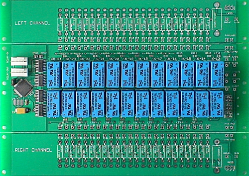 The Volume Relay Board houses the shunt attenuator along with 24 stereo relays (the same type used on the Input Selection Board). This is the only board that you have to populate yourself width 48 resistors. It also houses some logic chips. It looks as though the board can be used and configured in different ways because the top and bottom are scored so as to be detachable from the main part of the board. I know from looking on the AudioNote Kits website that two of these boards can be used to provide balance control and in those pictures, one of the parts of each board have indeed been removed.